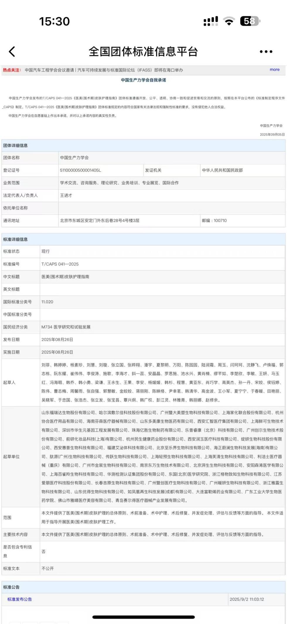 2025 жылдың 26 ​​тамызында Қытайдың өнімділік қоғамы және саладағы бірнеше жетекші компаниялар бірлесіп әзірлеген «Медициналық эстетикадағы тері күтімі бойынша нұсқаулық (периоперациялық кезең)» топтық стандарты (стандарт нөмірі: T/CAPS 041 - 2025), соның ішіндеЦиндао Саилдар медициналық құрылғылар индустриясын дамыту Co., Ltd., ресми түрде шығарылды және жүзеге асырылды. Бұл оқиға менің елімнің медициналық эстетика индустриясын стандарттаудағы алға басты қадамды білдіреді және сонымен қатар Циндао Саилдар медициналық құрылғылар индустриясын дамыту Co., Ltd дамуына күшті серпін береді.
